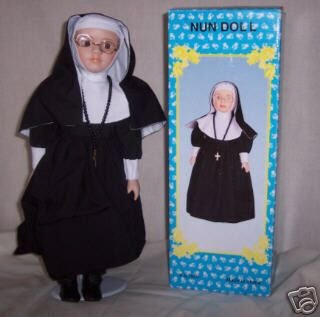 NUN DOLLThe Nun Doll will be an inspirational addition to your doll collection Handpainted porcelain face is frames by traditional habit Includes removable wire rim glasses rosary beads gold tone cross and leather like shoes About 16 tall and comes with its own metal doll stand About 16 ta Read More..